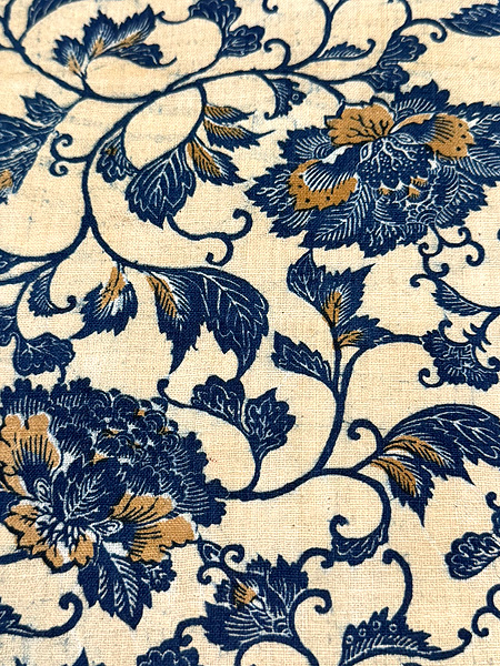深い藍の中に、ベンガラがかわいく配されていて、葉っぱ、茎や小花の形から優しさが湧き出ています。