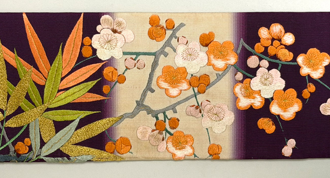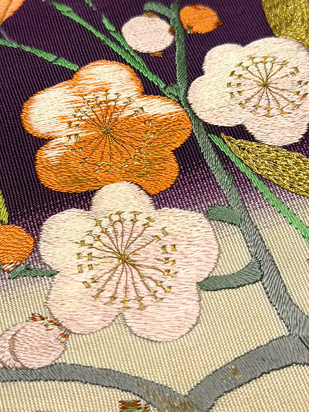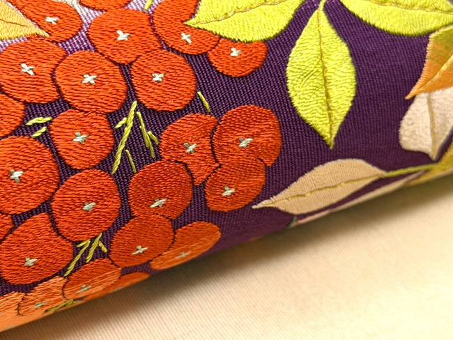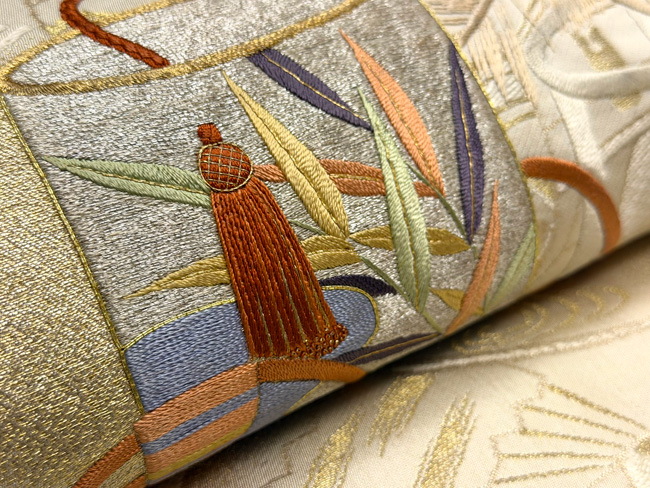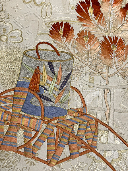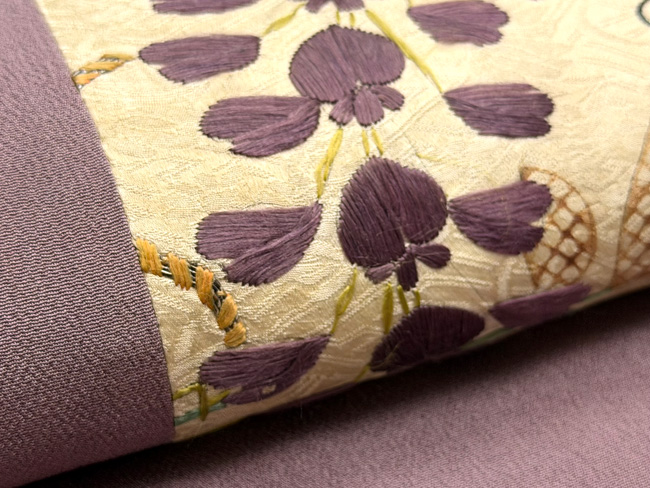 硬い綴れの上にたくさんの刺繍を施して、想像を超える仕事かと推測される帯です。