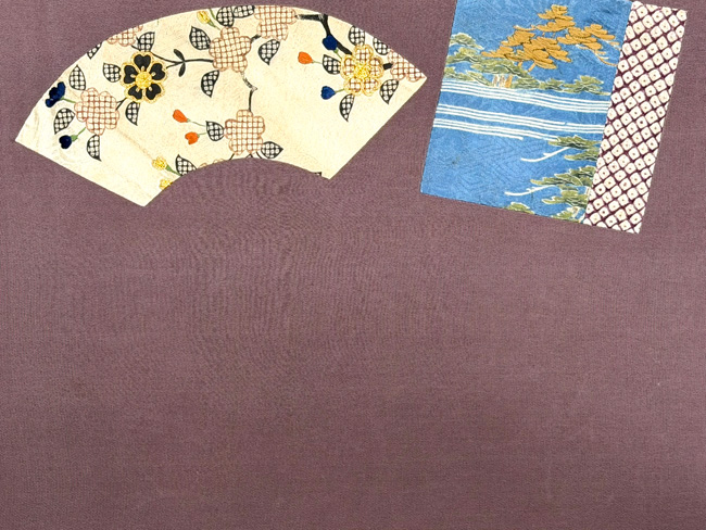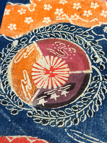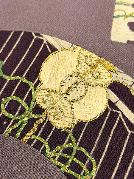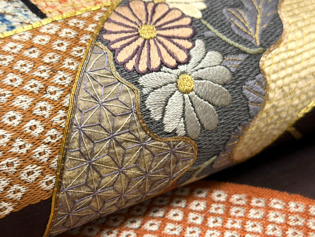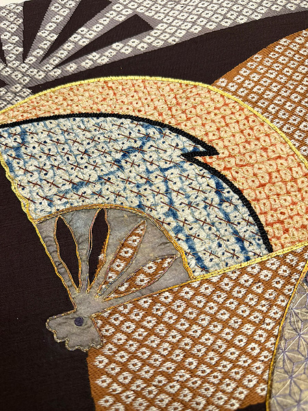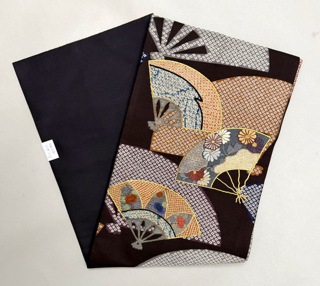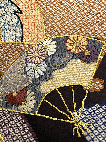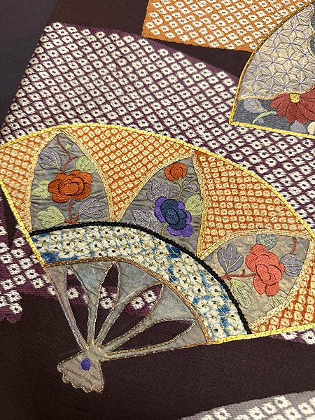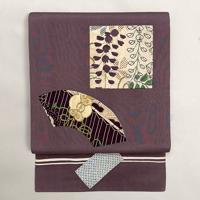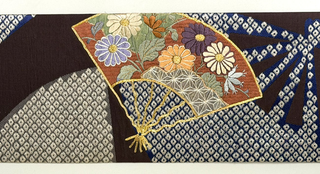 大きな扇面の上に、江戸期の布を置いて上から刺繍を入れた贅沢な名古屋帯です。