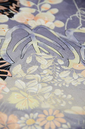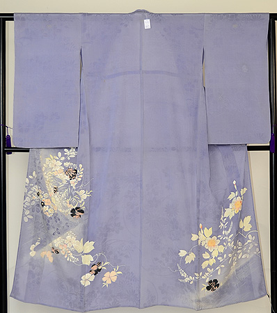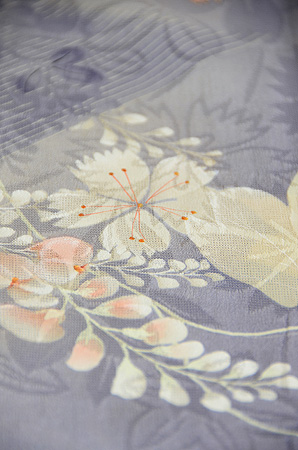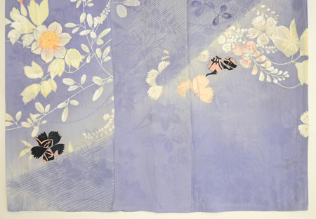 裾の秋草の柄を、御簾から透かして見ているような風情の模様です。 それを地紋の秋草がしっかりと演出して、涼感たっぷりの単衣となっています。 衽と背に少し色焼けがありますので、店頭にてご覧ください。