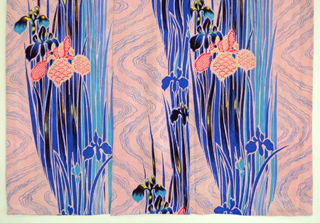 まるで縞のように走る杜若が、とても斬新な意匠です。 花は青、黒、赤と染められ、桃色の地とは裏腹に、纏えばしゃっきりと粋な単衣です。
