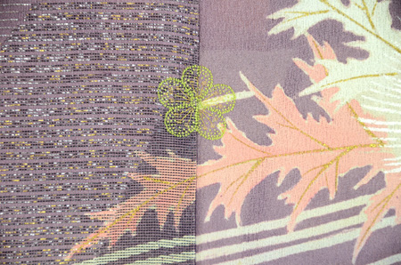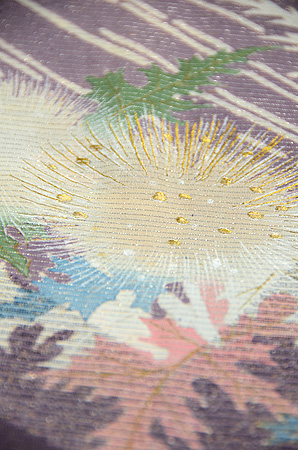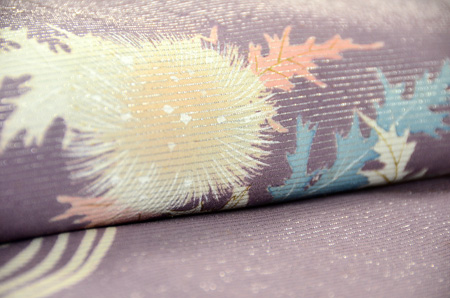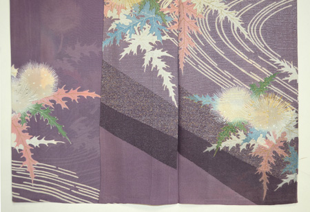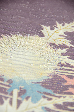金糸に銀糸、漆糸がおしげもなく織りこまれ、あざみが陽の光をあびて輝いているようです。 縫い紋は梅の芥子縫いで、まるで模様のように美しく、品の良い色づかいの中にも、あざみの葉の形がアクセントとなり、このきものを一層魅力的に見せています。 華族のお姫さまのあでやかな面影がほのかに浮かんでくるような、豪華な訪問着です。
