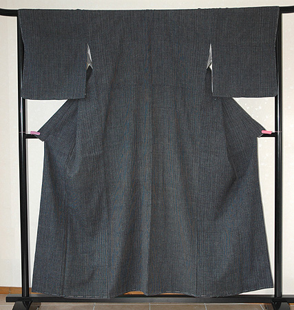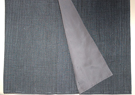 藍とグレーの細かい微塵格子の本場結城紬です。 八掛もシックなグレーを付け、帯でアクセントをつけて洋服感覚で気軽にお召しいただけます。 |