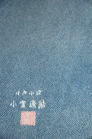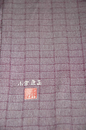 小宮康助氏、康孝氏に続く3代目小宮康正氏の作品です。 型は増井一平氏による突彫小紋です。 石畳のような格子文様が粋な印象を与え、帯次第でコーディネイトが楽しくなる着物です。 |