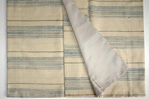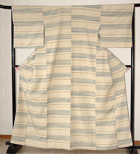 袷に仕立て直しをして、切繰越で大きなサイズになりました。 ベージュに静謐な横縞が春を予感させてくれる着物です。 |