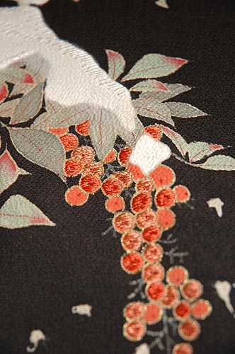 縮緬地に雪持ち南天が描かれた訪問着です。 上前部分の南天と雪には刺繍が施され、立体感のある柄に仕上がっています。 南天と雪が黒地に映え、ご着用いただくとはっとするほど華やかな訪問着です。 |