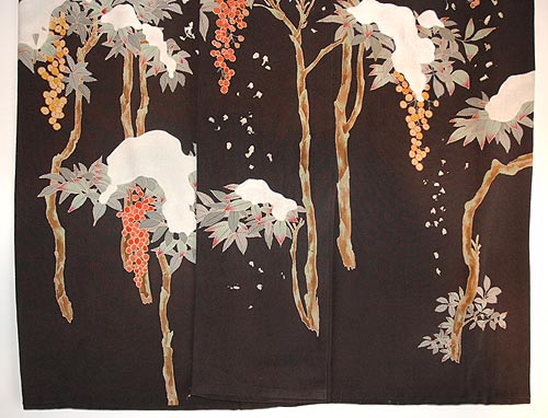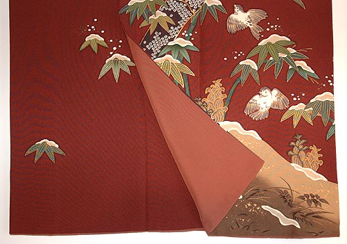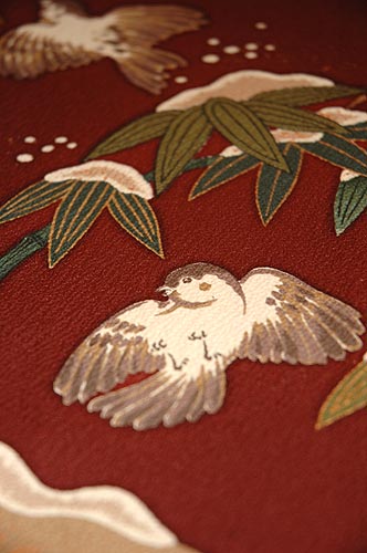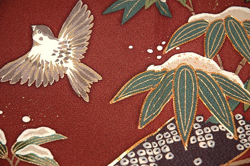 花井幸子さんの雪持ち竹に雀の柄の付下です。 竹の葉には金糸の刺繍で縁取りがされ、豪華さを演出しています。 |