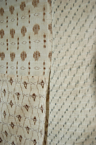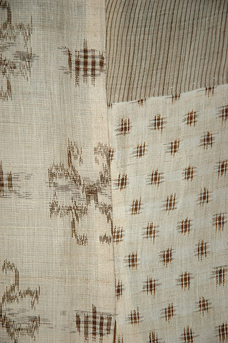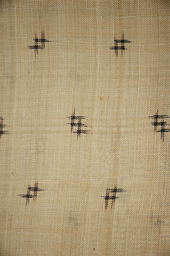 1600年代初め、琉球が薩摩に侵攻され始まった厳しい人頭税。 御絵図(図案帖)の通りの上布を献上することが課せられ、八重山地方の女性達は高度な技術と大変な労力とを強いられました。 その労苦のもとに発展したしたのが、八重山上布です。 1903年までの約300年もの間、その貢納布制度は続きました。 その後、明治の終わりに組合が結成され、産業として大きく栄えましたが、昭和の大戦により衰退。 戦後は数名のみでほそぼそと織られていましたが、平成元年に経済産業大臣により伝統工芸品として指定されました。 現在は4人の伝統工芸士が担い手となり、受け継がれています。 糸は苧麻の手紬糸を用い、手括り、捺染により染められます。 白の地に織り出された茶系の絣文様は、八重山のみに自生する紅露(クール)によるもので、大半の自然染料は日光により退色しますが、紅露は日光に当たれた当たるほど色が濃くなる特異な性質があります。 紅露、フクギ、藍により染められた上布は、高機で織られ、その後天日干しし、最後に海水にさらすことにより、麻が更に白くなり、色止めの効果もあるそうです。 まさに八重山の人の手と太陽と海に生み出され、何世代にも渡り受け継がれた宝物のような反物に感嘆せずにはいられません。 夏の風が体を通り抜けます。 |