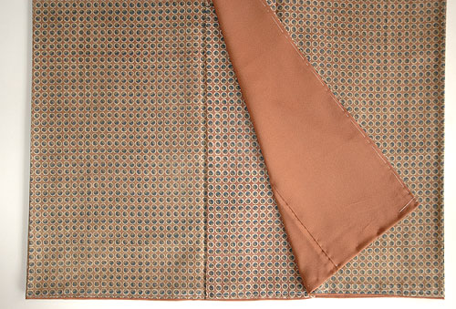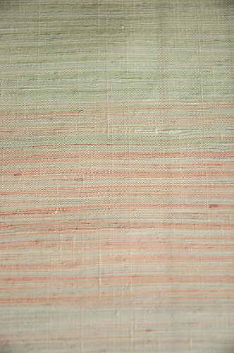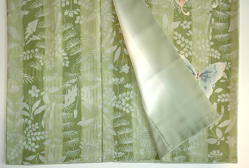 グリーン系を貴重としており、この春すぐにお召しいただけます。 優しい風合いの紅花染です。 |