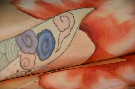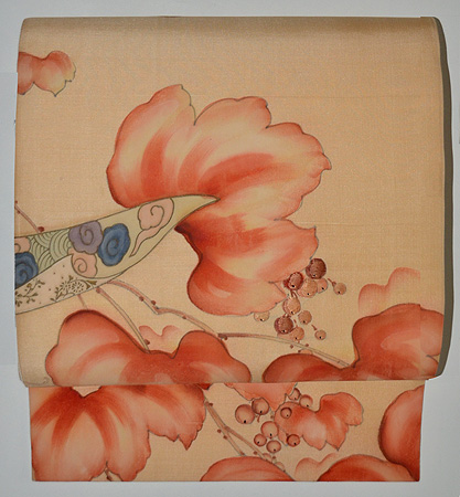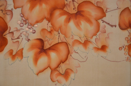秋色漂う塩瀬の帯。 葡萄に効果的なスガ縫いが施されています。 昨日まで夏物を紹介していたのに、もうすぐ着物の季節には秋がやってきます。 このまま暑い夏も一気に過ぎ去ってほしいものです。