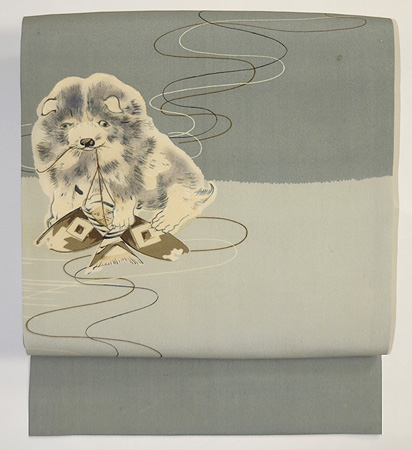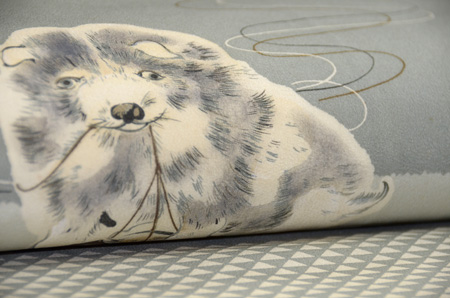 空を舞う凧を射止めたのでしょうか、得意気に凧と遊ぶむく犬が可愛らしい羽二重地の名古屋帯です。 シックな色合いで茶系や藍の紬に良く合います。 今は周りを見回しすと綺麗なワンちゃんが多いですが、一昔前はこんな愛嬌あるむく犬ばかりでしたよね。 数か所、経年によるシミがございますので店舗にてご覧くださいませ。