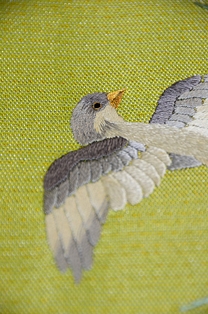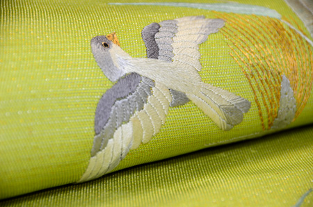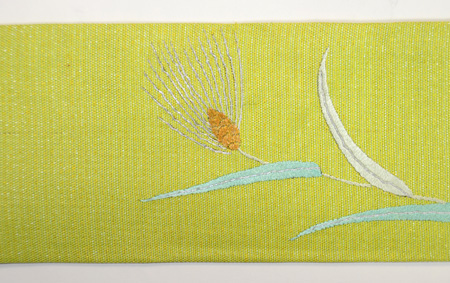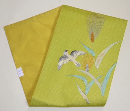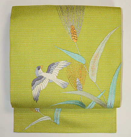 金銀通しの鶸色の地に、まっすぐの伸びた麦と、その周りを飛び回る小鳥が刺繍されています。 太めの刺繍糸が小鳥に柔らかな質感を与え、麦の穂に挿された金糸と銀糸が豊かな自然の恵みを感じさせてくれます。 桜の季節が終わり、野山が新緑に萌えるころ、素敵にお召し頂きたい帯です。
