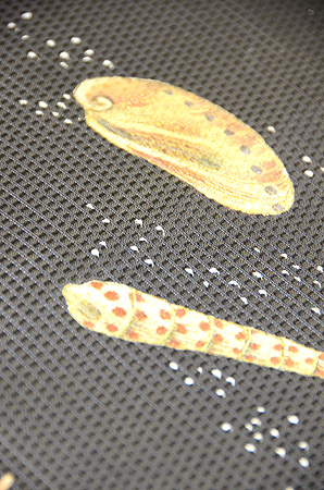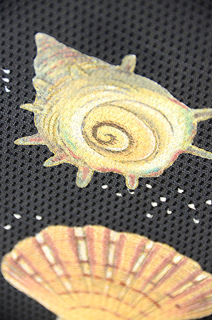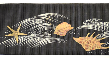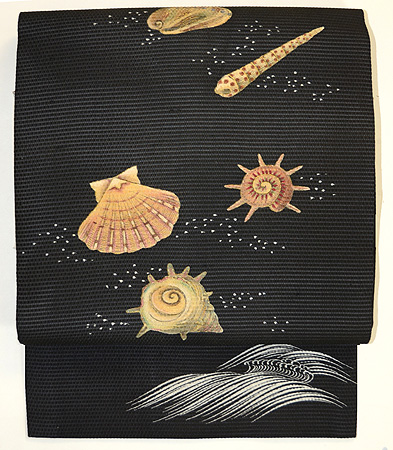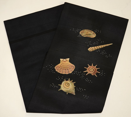 お太鼓には帆立、サザエにアワビ、前柄にはツブガイといろいろな貝が描かれた貝尽くしの帯。 貝のところどころに、金糸と銀糸が駒留めされて、貝の光沢感を引き立てています。 でも、よく見てみるとどれもおいしそうな貝ばかり… 海に思いをはせるよりも、今夜の食卓に気持ちが行ってしまいそうです。