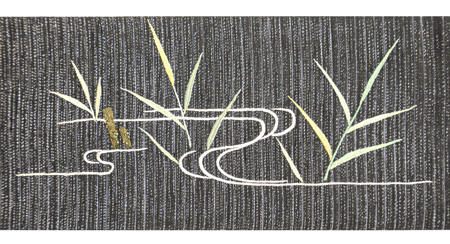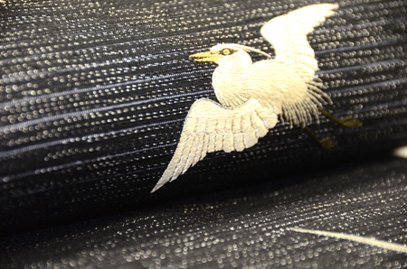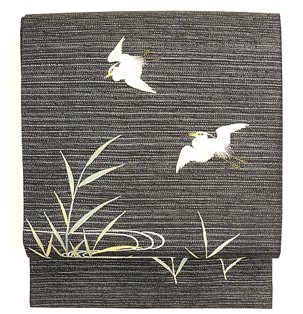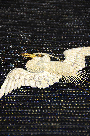 銀通しの代わり絽駒に、鷺のつがいが刺繍された帯です。 繊細で見事な刺繍の技術は、昭和初期の職人の技でしょうか。 引き抜きだったものを、締めやすいようにお直しして仕立て直してあります。