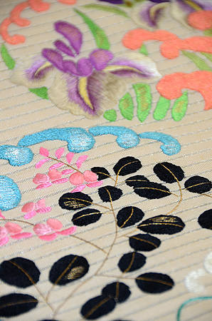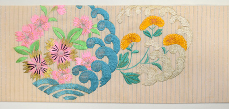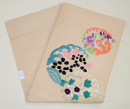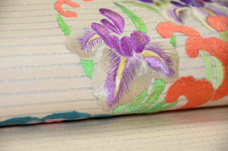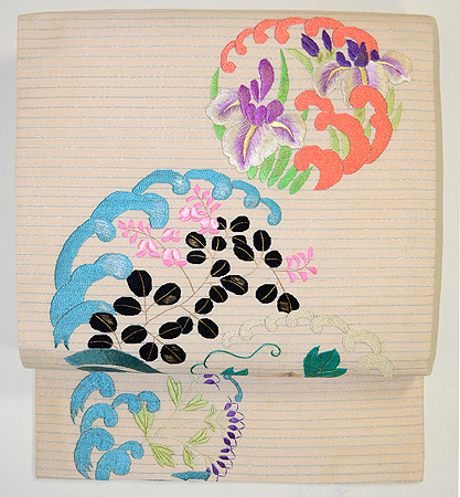 銀通しの地に、杜若、萩、鉄線、女郎花、桜など、四季の花々が鮮やかな色糸で丁寧に刺繍してあります。 色合いも雰囲気も大人の帯といった感じでしょうか。