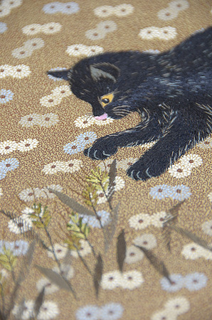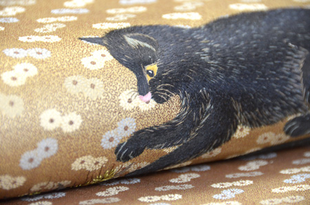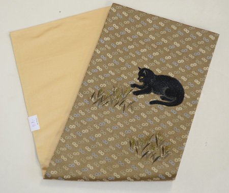 どこかで見たことがある帯だと思われるかもしれませんが、昨年9月にホームページ掲載と同時に売約済みとなった帯の色違いバージョン。 前回は白猫でしたが、今回は黒猫になっています。 猫の色が変わると、帯の雰囲気もだいぶ変わりますね。