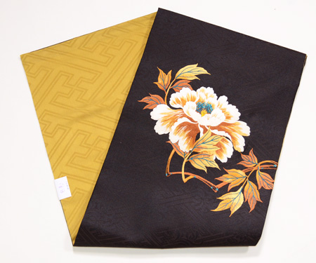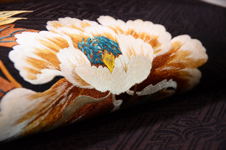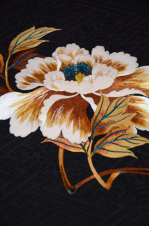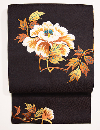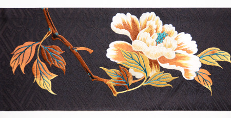 大輪の牡丹が浮かびあがり、凛とした美しさのある刺繍の名古屋帯です。 どんなかたがお求めになり、どんなお着物に合わせるのか、少し気になります。 きれいな紬でもいいですね。