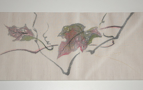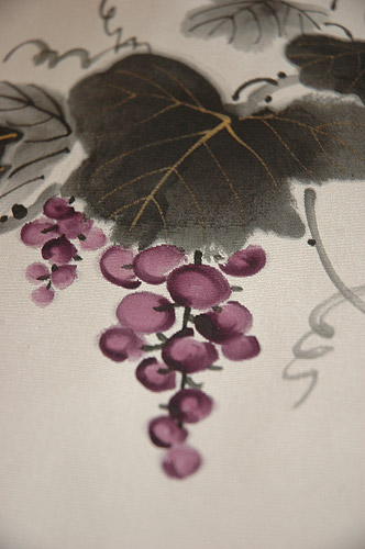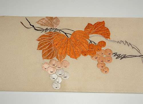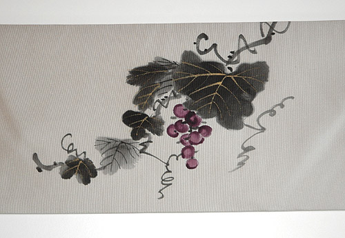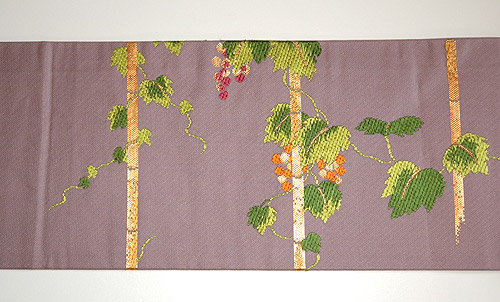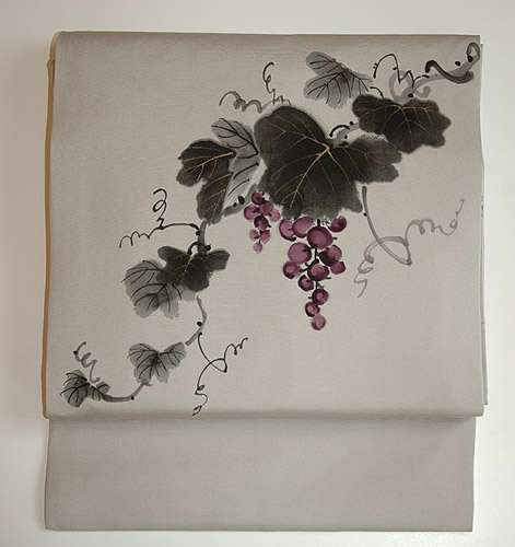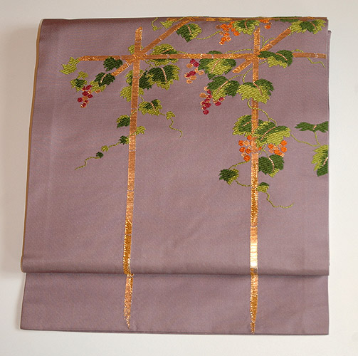 葡萄棚に可愛らしく房をつけた葡萄の実。 初秋の帯としてお楽しみいただけます。 |