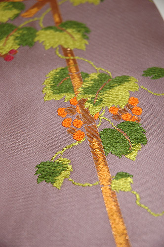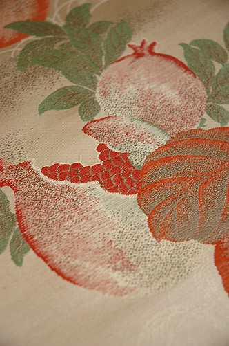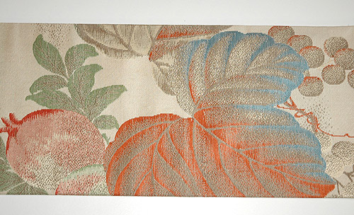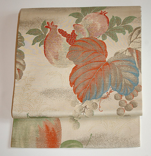 ルビーのような鮮やかな石榴、たわわに実った葡萄などの果物が帯全体に施され 収穫の喜び、味覚の秋を感じさせてくれる帯です。 |