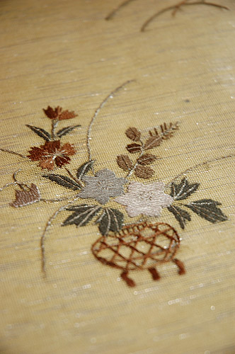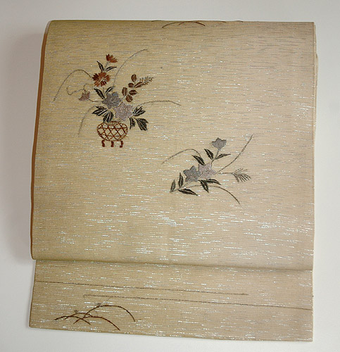 秋の月夜を思わせる黄色と銀のぼかし地に、秋の花篭と露芝を刺繍した帯です。 露の玉でより植物の瑞々しさが表現されているようです。 |