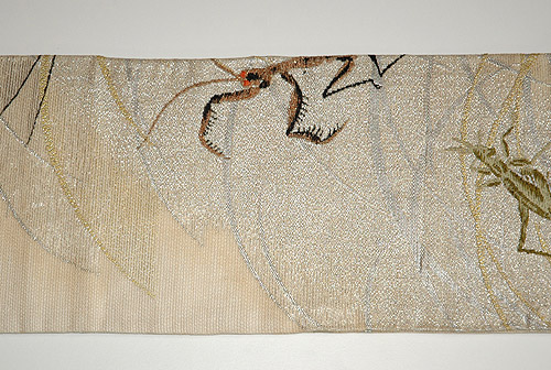 秋も近づき、暗闇に光る蛍、ばった、鈴虫が繊細に描かれた 初秋の涼しげな様子を感じさせてくれる秋の帯です。 |