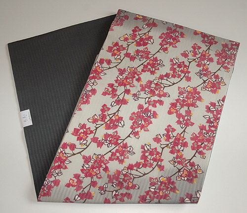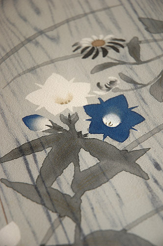 地はかわり絽でグレーのぼかしに花が咲きあふれています。 型染作家 岩井香楠子さんの作品です。 |