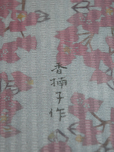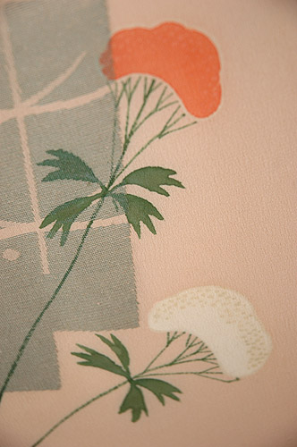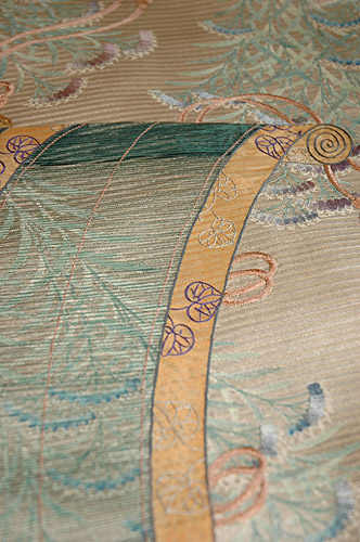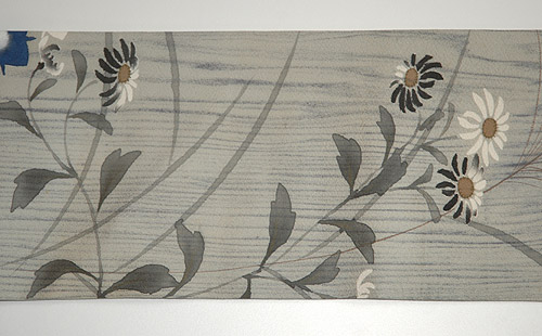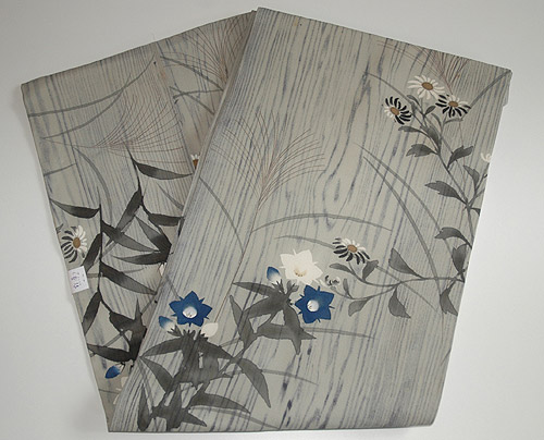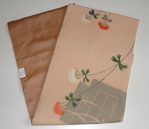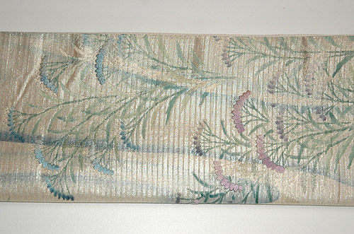 単衣のたおやかな柄に惹かれ、帯に仕立て直しました。 昭和初期の織りと友禅が、地色と見事に調和しています。 |