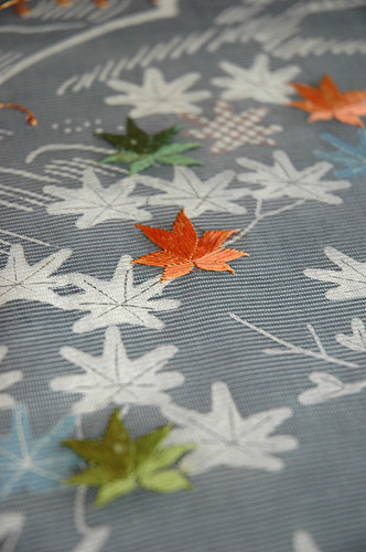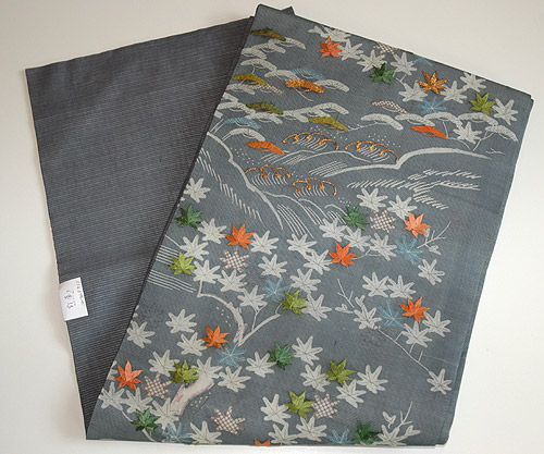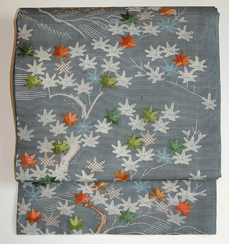 流水のある庭園に徐々に紅葉していくもみじ。 清涼感のなかに品格が漂う帯です。 |
