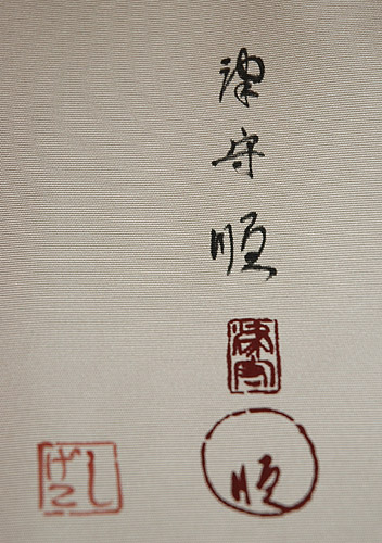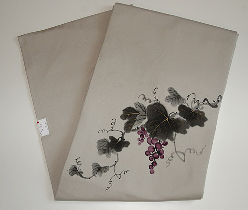 落ち着いた色調に、紫の葡萄の実が効いた合わせやすい帯です。 芯が入っていないため柔らかくお使いいただけます。 落款があり、津守順さんの作品のようです。 |