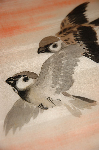 秋の夕暮れに家路を急ぐ雀の家族でしょうか? 雀は手書きで描かれており、紬、柔らか物どちらにもお合わせいただけます。 |