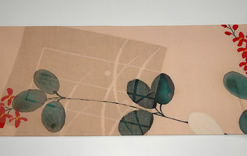 着物から帯に仕立て直しました。 無線友禅の技がさえて、大人の雰囲気を漂わせる帯に仕上がりました。 |