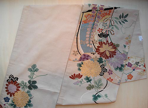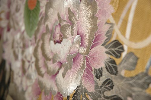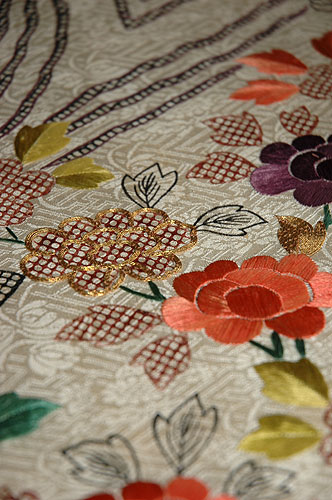 大正時代の綸子地の丸帯を切り替えて丈を長くしました。 大きな芍薬と魚が刺繍で描かれたお正月に向く豪華でおめでたい柄です。 |