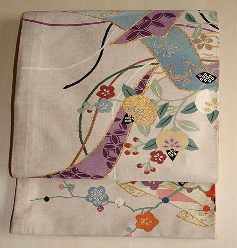 羽二重地に波紋と船が染めで描かれ、梅には金糸で縫いが加えられています。 ちょっとしたおでかけに重宝する帯です。 |
