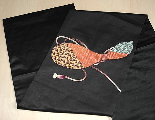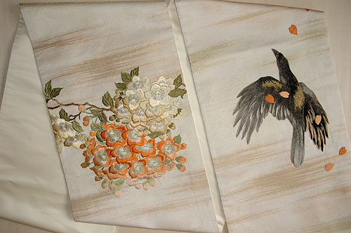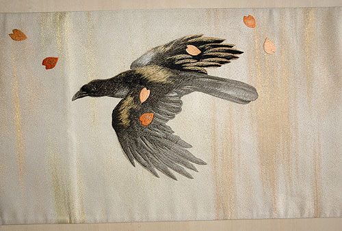 アンティークの丸帯を解いて十分な長さの袋帯に仕立て直しました。 前柄は大きなカラスの刺繍が入っています。 |