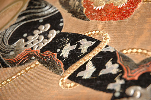 唐獅子牡丹に波千鳥の柄の鼓胴を刺繍と螺鈿で表現しています。 淡い地色と相まって格調高いアンティーク帯です。 |