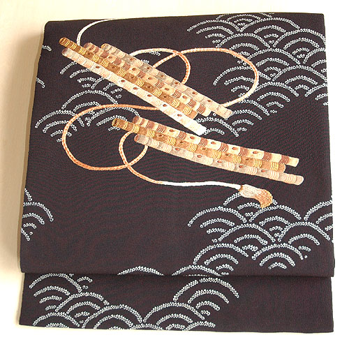 絞りの青海波に収集で横笛をあしらった文芸模様になっています。 柔らかもの、紬にもお使いいただけます。 |