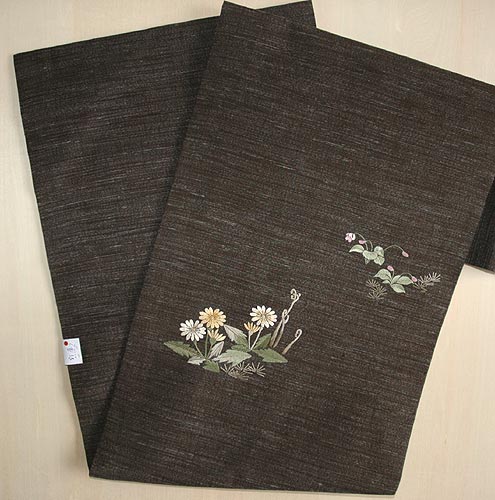 紬地の名古屋帯に春の野草の刺繍を施しました。 ベージュ系、茶系の紬に合わせて春の装いをお楽しみください。 |