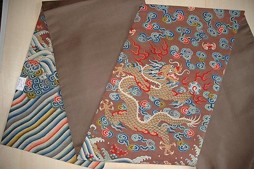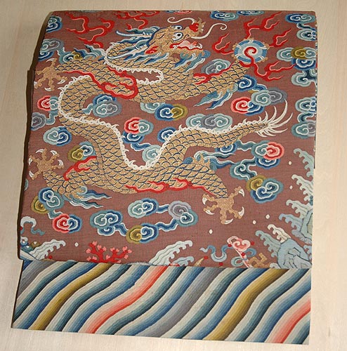 中国、明朝の綴れを大正時代に丸帯に仕立てたものを、現代風に切り替えて袋帯に仕立て直しました。 明のものとは思えないほど非常に状態が良いものです。 年始のラグジュアリーな装いに相応しい豪華な帯です。 |