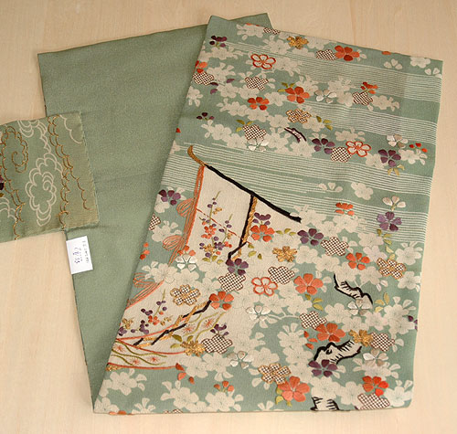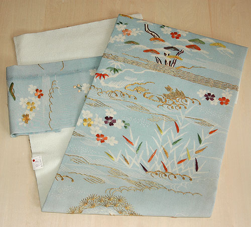 江戸衣装から仕立てた付帯です。 縮緬地で松原に天女の羽衣、漁師の魚篭が施されています。 典雅漂うアンティークの帯です。 |