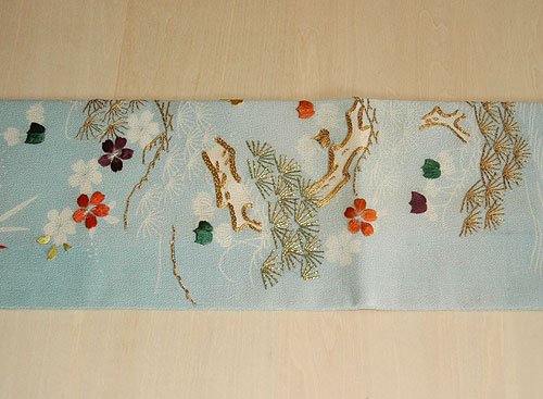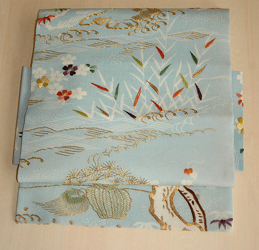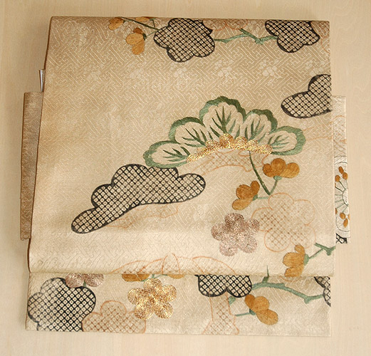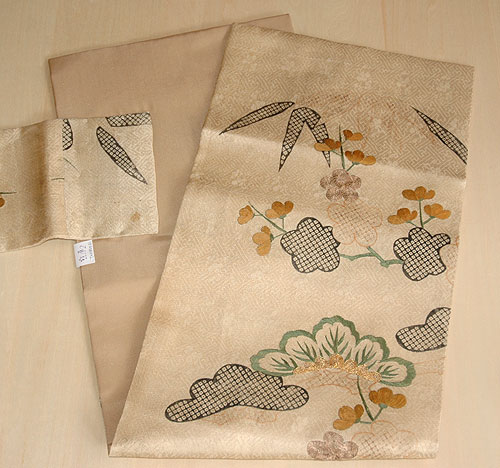 鞘型地紋に松竹梅が伸びやかに配されており、武家の品格漂う図柄です。 黒地、古代紫、暗緑色、茶色の着物にぜひ合わせていただきたい帯です。 |