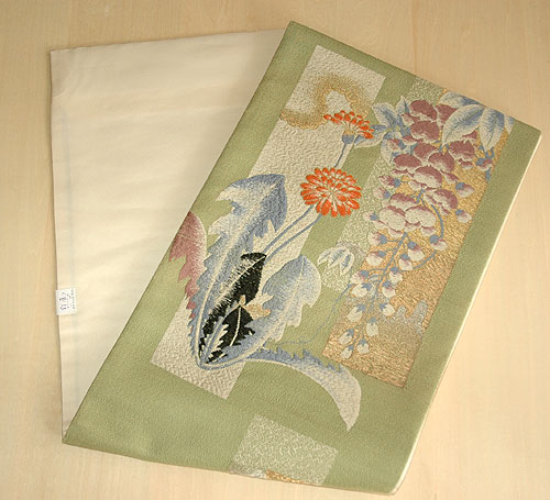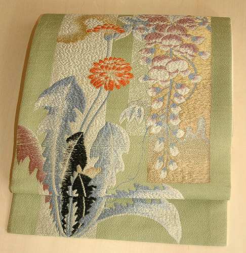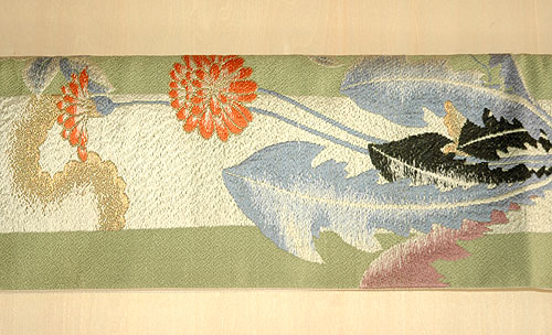 色、柄ともに生命力に溢れた春らしい帯です。 紬、柔らかものどちらにもお召しいただけます。 |