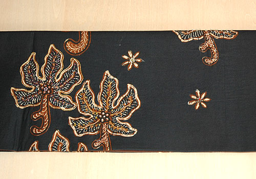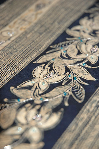 同じくバティックにビーズの刺繍を施した灯屋2の自慢のラインです。 モダンで印象的な南国の木にビーズ刺繍を施すことで、その存在感を際立たせて豪華な帯に仕上げています。 こちらもぜひ大きな画像で、ビーズ刺繍の作り出す独特の存在感をご覧ください。 |