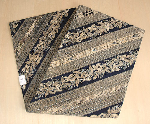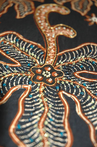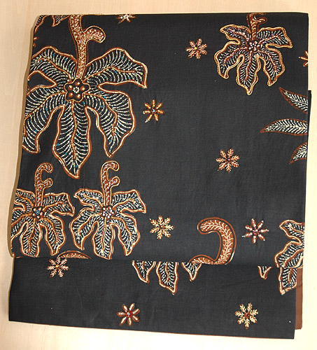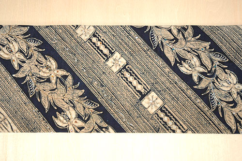 インドネシアのバティックから仕立てた帯で、お太鼓と前中心の部分にビーズと金糸で刺繍が施してあります。 ビーズ刺繍による繊細で立体的な美しさが際立ちます。 ぜひ質感の写真をクリックして大きな画像をご覧ください。 |