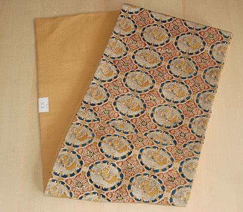 暖色系で唐草に鳳凰の図柄の施された袋帯です。 色やけなどのない非常に常態のよい帯です。 |