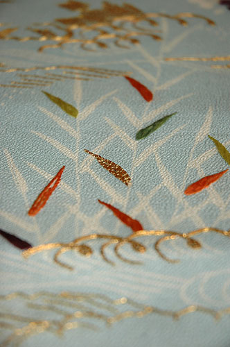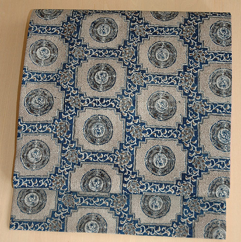 江戸型染めの開き名古屋帯で、全部で4色で染め上げられています。 4色ということですから、型を4枚使っているということになります。 熟練の手仕事を感じさせてくれる素晴らしい帯です。 |