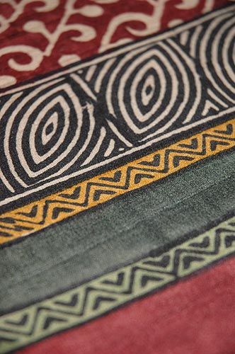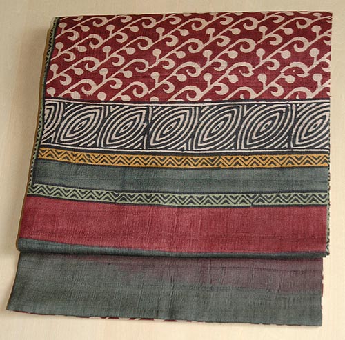 ウッドプリント(木版)にて染められたシルクサリーから仕立てた帯です。 アジア、アフリカの両方のテイストをミックスさせたようなプリミティブな図柄がリズミカルな印象です。 無地の紬に合わせて、帯を主役にしたコーディネイトをどうぞ。季節に関係のない柄ですので、3シーズンを通してお使いいただけます。 |