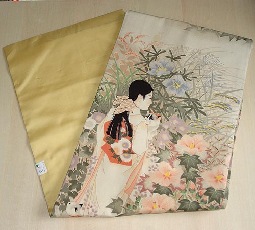 猫を胸に抱き秋草を物思いにふけりながら眺める女の子。物語性のある図柄の帯です。 絹は二重地、帯裏は薄黄色の絹地になります。当店仕立品です。 |