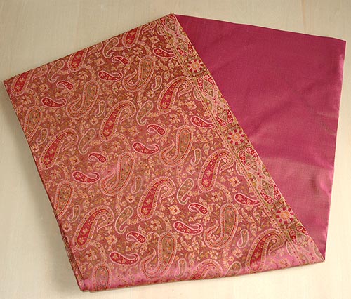 交織(シルクとウールの混合織)によりペイズリー文様と可憐な小花文様が織り出されたシルクサリーから仕立てた帯です。 光の角度によって変わる光沢感がラグジュアリーな雰囲気を醸し出します。 |