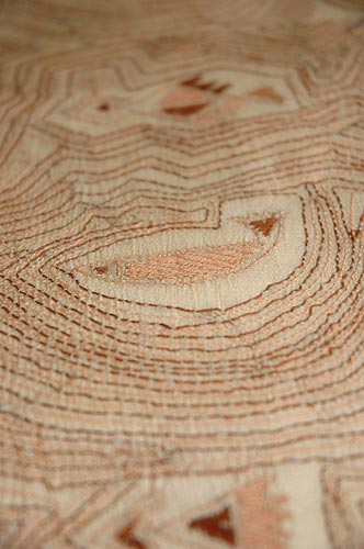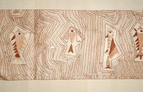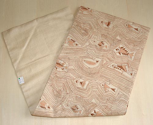 人気のカンタ(インド西部の手刺繍による刺子)シリーズです。 これはトビウオ?イカ?と創造してみるのが、楽しくなるようなサカナ柄のカンタです。 薄いアイボリーの絹地に2色の木綿糸で刺子が施され、見るものを和やかにさせてくれる温もりあふれる帯です。 |