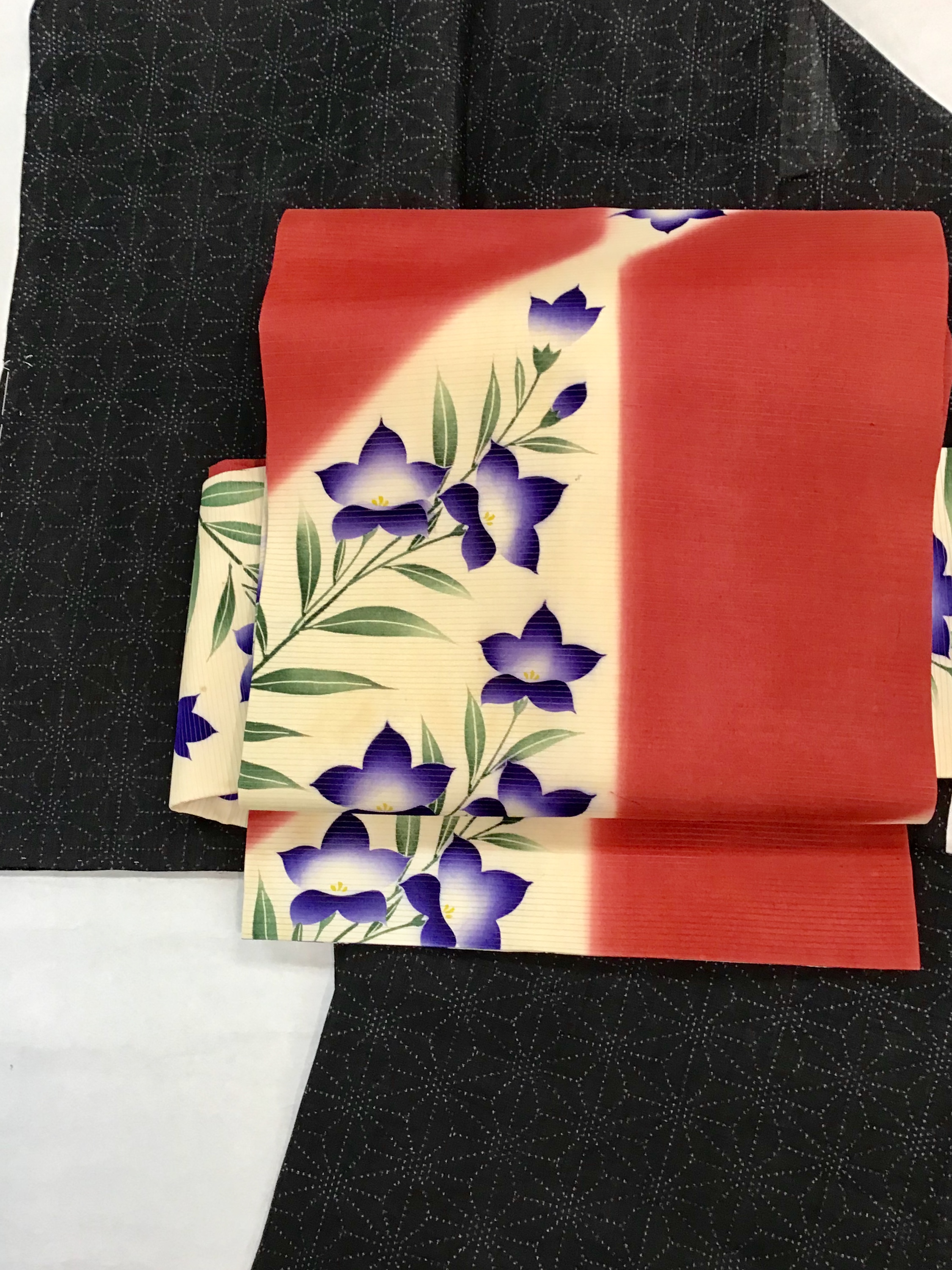 まずは白と紅に染め分けた絽生地に紫の桔梗が咲いた名古屋帯を載せて可憐な姿を演出します。